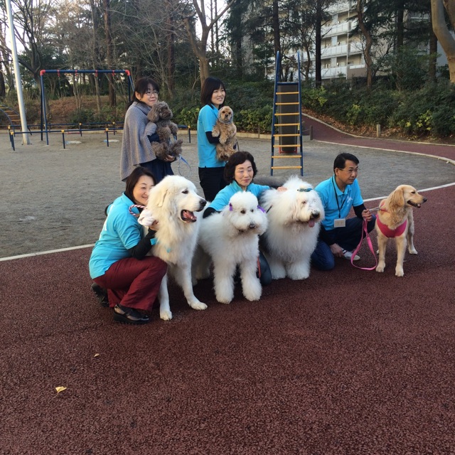 そこへ大型犬4頭、小型犬2頭での訪問です。アニマルセラピーの概略をお話し現役のセラピードッグと沢山触れ合っていただきました。中には「うちの子、セラピードッグになれるかも」と認定試験も始まったり(*^^*)