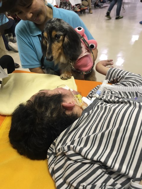 ストレッチャーのお顔の横でご挨拶するダックスさん。